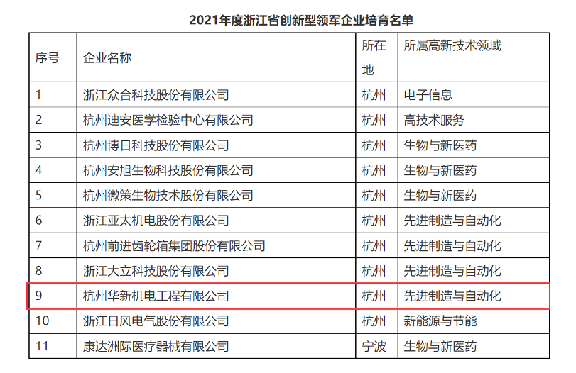 近日,浙江省科學技術(shù)廳發(fā)布了《關(guān)于公布2021年浙江省創(chuàng)新型領(lǐng)軍企業(yè)名單的通知》,華新機電憑借持續(xù)提升的自主研發(fā)與科技創(chuàng)新實力,成功入選“2021年度浙江省創(chuàng)新型領(lǐng)軍企業(yè)”培育名單。