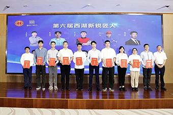 ▲圖為區(qū)人大常委會副主任、區(qū)總工會主席馬定忠為第六屆“西湖新銳匠人”頒發(fā)證書。(左一為馬智淵)