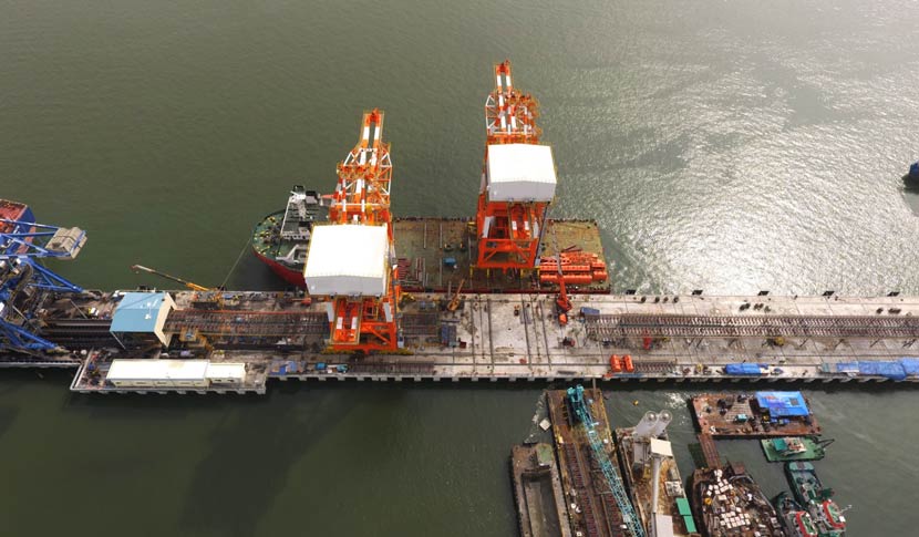Tanjung Bin電廠在碼頭一期工程建設(shè)時,配置了2臺德國鏈斗卸船機。2012年,電廠考慮將鏈斗卸船機更換為抓斗卸船機。當(dāng)年,華新機電與Tanjung Bin電廠進行了第一次合作,并于2013年提供了1臺2000tph抓斗卸船機,在電廠碼頭采用大件吊裝的方式吊裝上岸并順暢使用。2017年,Tanjung Bin電廠進行碼頭二期的工程建設(shè)。電廠向華新機電再次采購了2臺2400tph抓斗卸船機,要求采用滾裝上岸方式交貨。2018年10月,兩臺2400tph抓斗卸船機在Tanjung Bin電廠碼頭順利滾裝上岸。